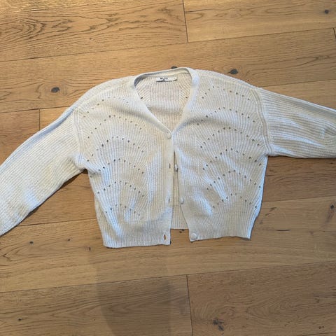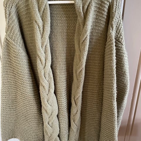 Pusete, lang og kjempemyk cardigan som fint kan brukes som jakke mot høsten. Litt Y2K-vibber over denne. Den har vide "slengermer" nederst og knapper til å lukke foran. Fargen er litt vanskelig å snappe opp på kameraet, men den er lik de lånte bildene. Ermene er noe lange, men oppleves ellers normal i størrelsen. Så og si ikke brukt.
