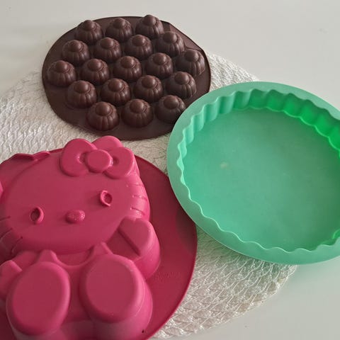 2 kakeformer, pent brukt. Den grønne er i silikon. Sorte i metall. Gøyale former til å lage kaker til feks barnebursdag. Selges samlet