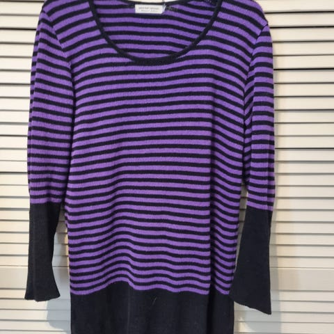Lekker genser fra Signature i str. M. Stilig mønster i lilla og svart, med ulike strukturer på over- og underdelen som gir et unikt uttrykk. Myk og behagelig kvalitet – perfekt til både hverdags og jobb.