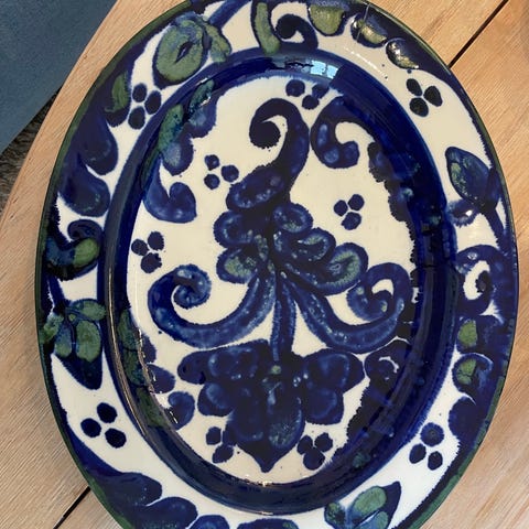 Vintage vakkert håndlaget fat i keramikk. Grønn-turkist. Kan sendes.