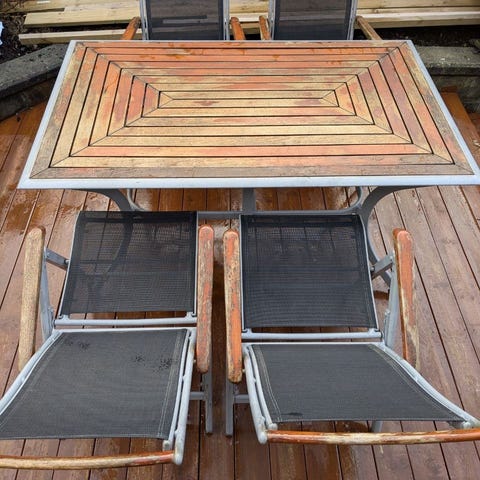 møblementet er i godkvalitet, med grålakert aluminium som konstruksjon og teak overflate og armer.