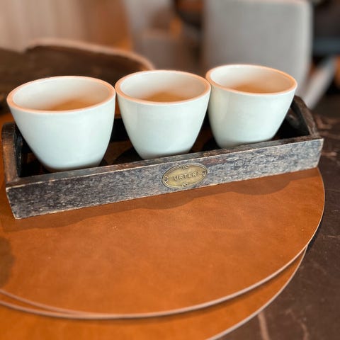 Retro tinnfat med teakhåndtak