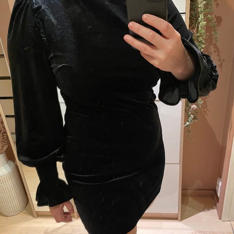 Elegant kjole med halvlange ermer i medium av merket Bastion. Svart bakgrunn med mønster i hvitt, som også har struktur. Sort underkjole. Glidelåslukking bak, pent og funksjonelt. Meget fin på, og klassisk stil. Stoffet er litt elastisk og behagelig å ha på seg. Passer like fint på kontoret som til selskap og med de trekvart- lange ermene passer den godt hele året. Meget god stand, kun brukt noen få ganger.