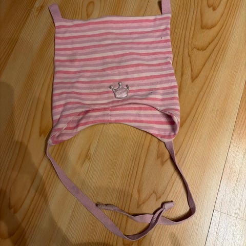Kjempesøt lue til baby i bomull. Litt vanskelig å si hvilken størrelse det er, men var i bruk her rundt 1-1,5 år tror jeg.