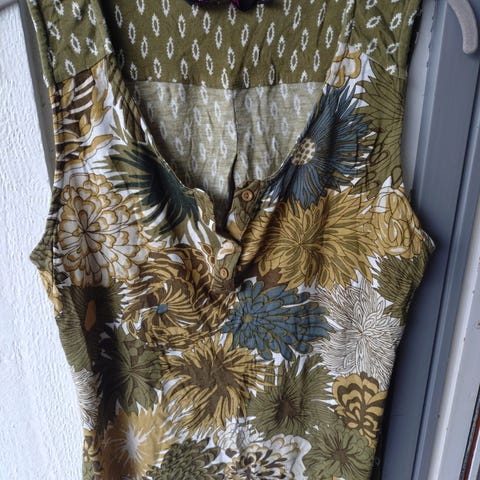 Sommerlig singlet fra NICOLE i størrelse L. Gulbrun bunnfarge med blomstermønster og dekorativ struktur i stoffet. Lett og ledig passform – fin både alene og under jakke eller cardigan.
