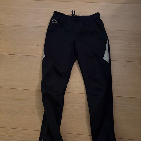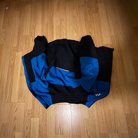 Norheim Ski/treningsjakke- og bukse Barn Blå Str. 12 år (152). Jakke er blå med svart for og har to glidelåslommer samt stramming i midje på begge sider og hempe for oppheng innvendig i nakken. Bukser er svart og med svart for, har snøring for stramming øverst samt hempe for oppheng innvendig bak og korte glidelås for åpning nederst. Det er ikke lommer på buksa.