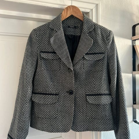 Elegant og lett jakke med ett dekorativt knappelukking i front. Sort bunnfarge med glitrende detaljer og geometrisk mønster i brunt, hvitt og kobber. Perfekt over en topp til fest eller som et blikkfang i hverdagen. Veiledende pris er 695 kr.