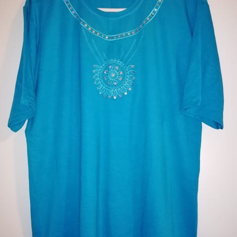 Topp fra Nicole i størrelse XL. Blåfarget med V-hals dekorert med små perler og paljetter for en diskret, pyntet look. Komfortabel passform og middels lengde. Ny med lapp. Veiledende pris 258 kr.