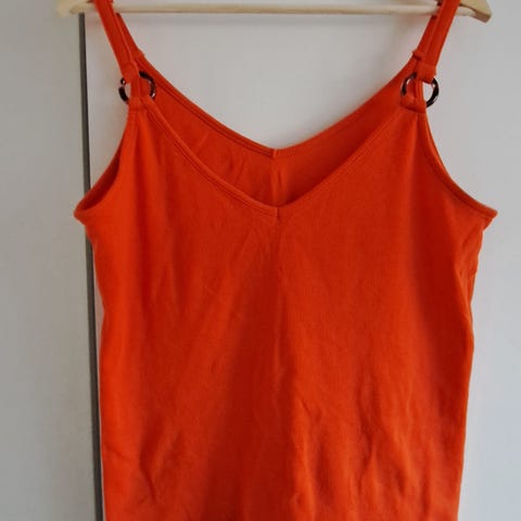 Tøff og knalloransje topp i størrelse S. Figursydd modell uten ermer med firkantet hals. Stoffet er elastisk og behagelig. Toppen er ny med lapp.