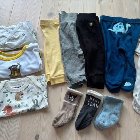 3 fine sammensatte sett i bomull. Body og joggebukse til gutt i størrelse 62. Klærne er i god stand.