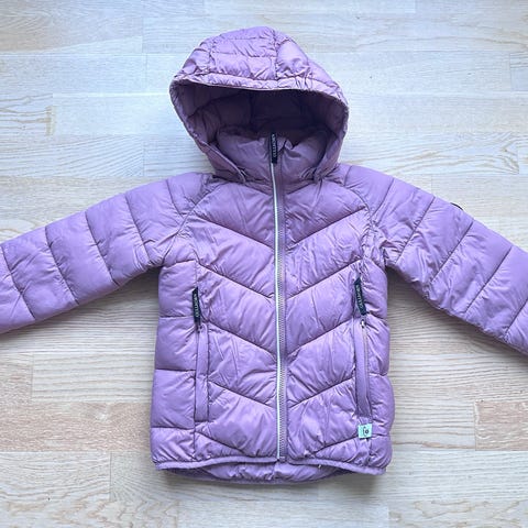 Pent brukt anorakk/jakke fra Gullkorn str 122. Glidelås i siden. Ved fotografering ses en antydning til en svak flekk, se siste bilde, regner med at den går av i vask.