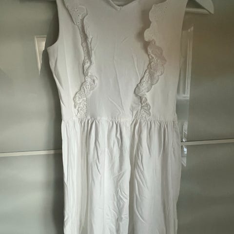 Nydelig hvit kjole med runde prikker i gull og sølv glitter farge. Str. 11 år