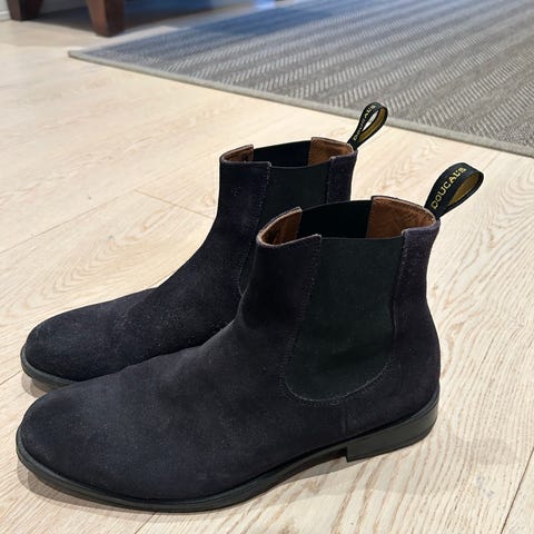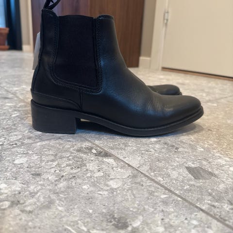 Pent brukte sorte Chelsea-boots fra Tiger of Sweden i størrelse 39. Laget i Italia av semsket skinn med elastiske sider og glatte gummisåler (se bilder). De er kun brukt noen få ganger – sålene har lette bruksmerker, men ellers er skoene i svært god stand. Klassisk modell som passer både til hverdags og fest.
