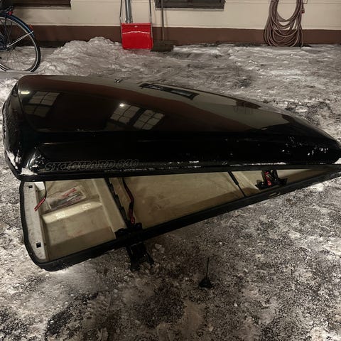 Thule Flushrail følger også med. Dette er kjøpt helt nytt i 2023 og nesten ikke brukt. Henger på takboksen. Kostet 4100 kr nytt og inkluderer: