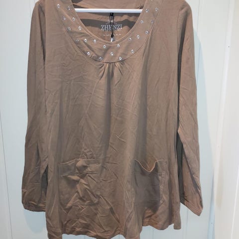 Behagelig og lett tunika fra Zhenzi i krøllet stoff med struktur og fine legg i utringningen. Trekvart erm og romslig passform. Størrelse M (tilsvarer ca. 46/48).