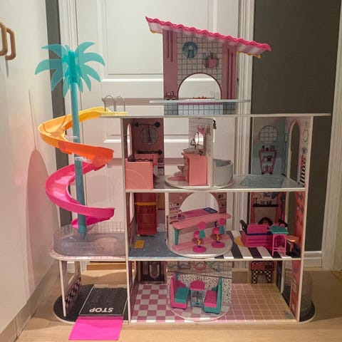 Selger et pent brukt LOL Surprise OMG Fashion House i ekte tre, komplett med møbler og masse tilbehør.