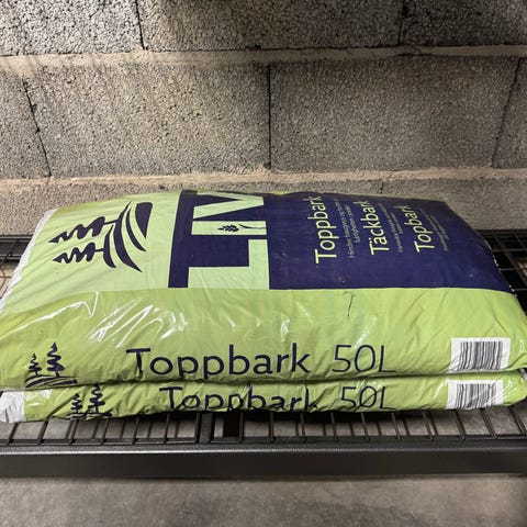 Minst 2 m3 med toppbark / dekkbark selges som vi har til overs. Pris 700,- pr m3. Kjøpt på Sundland.