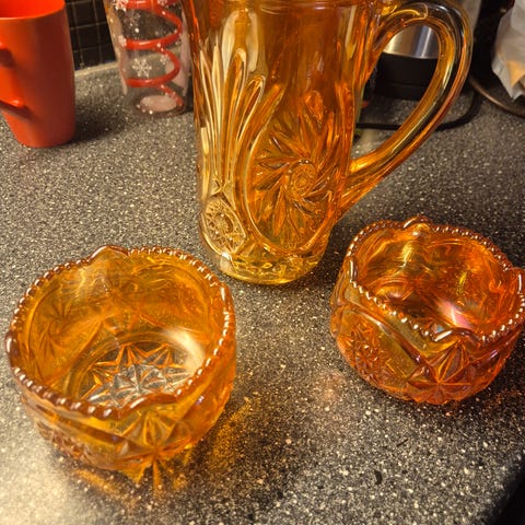Den har noen merker inni, er litt misfarget i bunnen og har ett lite merke i et "blad" på utsiden. Se bilder 4 og 5.