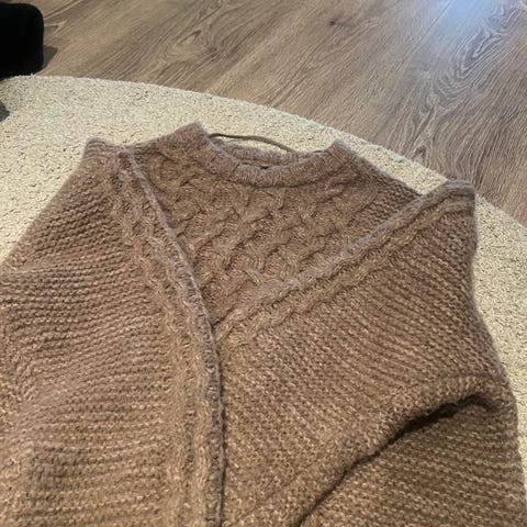 Høyhalset genser i blått, størrelse M. Genseren har en løs passform og er laget av mykt materiale, ideell for kjøligere vær. Passer til uformelle anledninger og gir komfort med stil. Den er strikket i dobbel tråd med garnet Lieva. Genseren er strikket litt lenger bak enn foran.