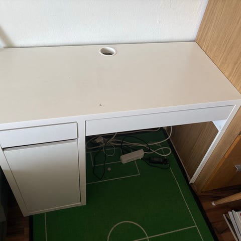 Dette er ikke fastmontert i hverandre, så skrivebordet er for seg selv, og en hylle med to hyllehøyder står oppå en skuffeseksjon. Genialt til barnerommet. Det er noen få merker etter bruk men det kan lett fikses med litt maling om man vil. Er ellers veldig pent brukt. Den store skuffen kan trilles på og har masse lagringsplass.