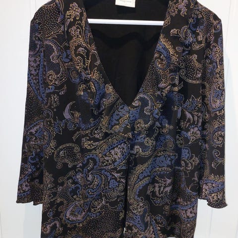 Stilig og lett jakke fra Exclusive i svart bunnfarge med paisley-inspirert mønster i blå og gulltoner. Jakken har v-hals, lett innsvinget fasong og et elegant uttrykk – perfekt til både hverdags og finere bruk.