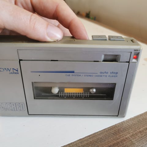 Diktafon / walkman med innebygd høytaler. Apparatet er mono, drives av to AA-batterier