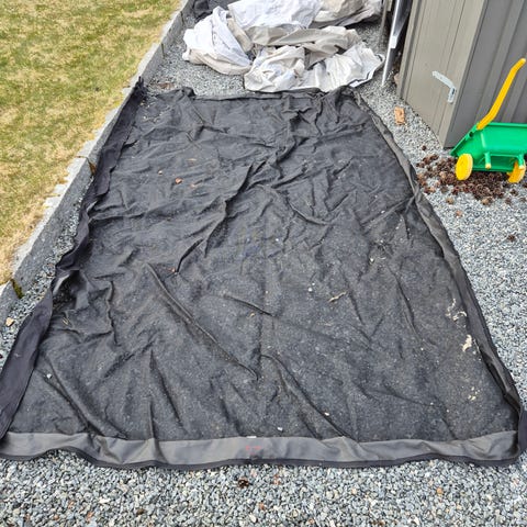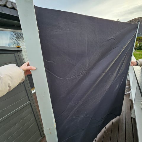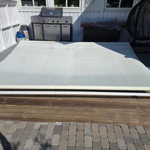 Markise 6,4m x 1,5m m/motor og fjernkontroll. Grå duk, litt støvete, men ikke særlig falmet. Fester medfølger, men må ha nye bolter. Kort strømkabel, må evt byttes tilpasses.