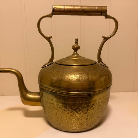 Vakkert kokekar i messing, med smijernshanker og nagler av kobber.
