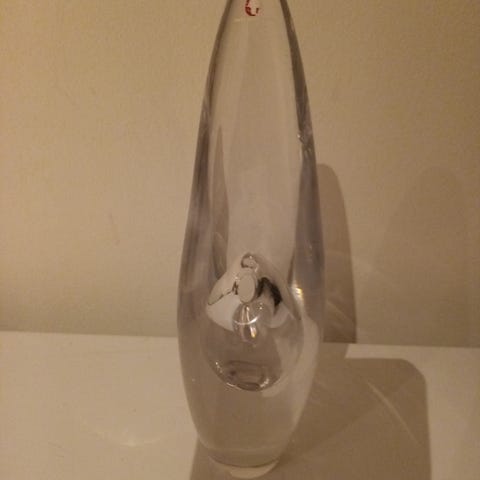 Den slanke vasen har en hårlinjefraktur på ene siden - se bilde. Linjen er ikke iøyenfallende, men vasen selges rimeligere pga dette: kr 290.