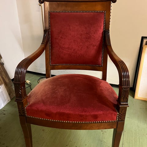 Søkeord: stol, lenestol, antikk, vintage, klassisk, fløyel, rød, retro