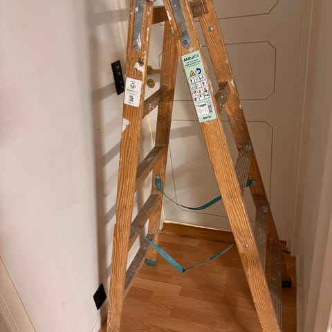 Trestige; Stige laget av tre. Stigen har flere trinn og er egnet for ulike bruksområder som klatring og vedlikeholdsarbeid. Materialet er tre, og stigen har en naturlig trefarge.