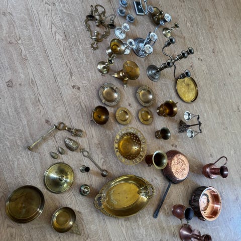 Vintage lysestaker, kandelabre og servise – messing og forgylte detaljer