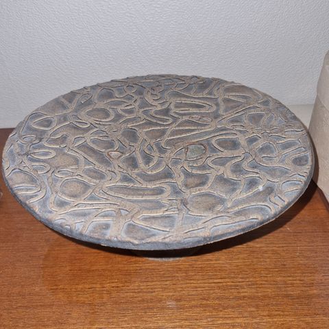 Selger ubrukt kunstfat med motiv som kan minne om natthimmel. Det er en fordypning i fatet som passer formen til formkaker.