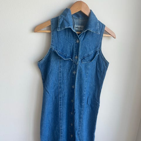 Vintage kjole i denim fra 70-tallet. Ikke merket med størrelse, men passer ca. S. Bryst: 45 cm. Midje: 37 cm. Lengde: 112 cm.
