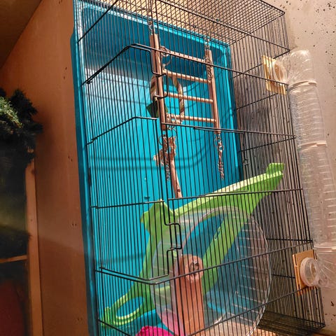 Perfekt for dverghamstere. Buret har riktig høyde. Med 3 plasthyller, stiger, en tunnel, en tredemølle, en matskål og et hus. Pluss tilbehør som vannflaske osv.