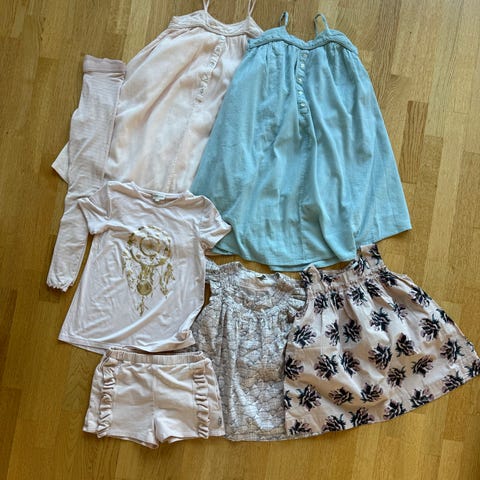 Selger liten klespakke med 2 skjørt, 3 skjorter, en topp og div . Passer til jente 8–10 år.