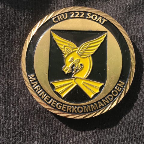 FSK. MJK. HJK. FS. MDK. KJK. Operatør. Forsvarets Spesialkommando. Kystjegerkommandoen. Hærens Jegerkommando. Marinejegerkommandoen. Forsvarets spesialstyrker. Spesialsoldat. Afghanistan. Fallskjermjeger. Sjøforsvaret. Hæren. Marinen. Dykker. Aqualung. USA utveksling. Ungdommens Heimevern. Politiet. Marinejeger. Heckler & Koch. HK. Delta. Politiets innsatsstyrke. Beredskapstroppen. Minnesota. HV utveksling. Militært merke. Hederstegn. Medalje. Coin. Token. Mynt. Crest. Plakett. Minnemynt. Utenlandstjeneste. Veteran. Heimevernsungdommen. HVU. Challenge Coin.