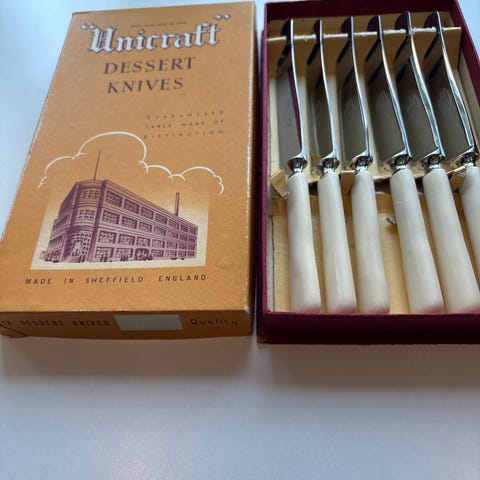 Kniver med hvite skaft fra Billam og Dhefgield England.