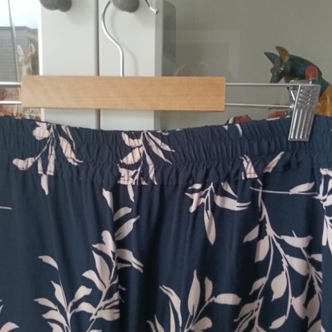 Midiskjørt fra Moss Copenhagen i satengliknende stoff som ikke er transparent, men allikevel lett og svalt. Skjørtet har strikk i livet og mulighet til å knyte det på siden med et bånd i samme mønster som skjørtet. Rekker meg som er 171 cm til litt under knærne.