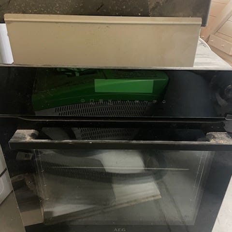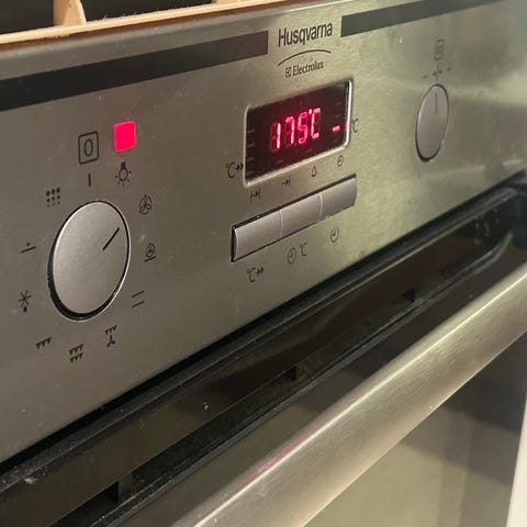 Alt fungerer, men det mangler et glass i fronten som gjør at døra må holdes nede for å ta inn og ut ting av ovnen. Det gjør også at fronten ikke har varmeisolasjon.