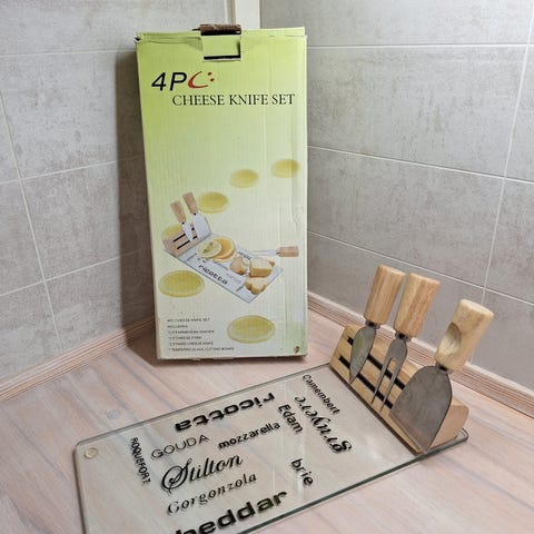 Nytt veldig fint ostefat i glass med kniver selges for 100,-. Nypris var 449,- hos Tilbords). Ikke tatt ut av eske.