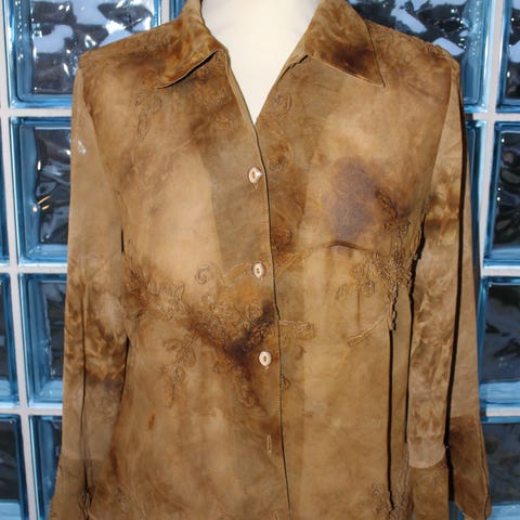 Elegant jakke i kobberbrun farge med blankt brokademønster. Den har klassisk krage, lange ermer og knappelukking i front. Stoffet har lett struktur og passer godt til både hverdag og penere anledninger.