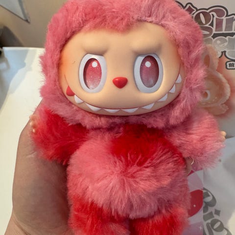 Selger en ekte Labubu kjøpt i sommer. Figuren er original og kommer med QR-kode for å bekrefte ektheten.