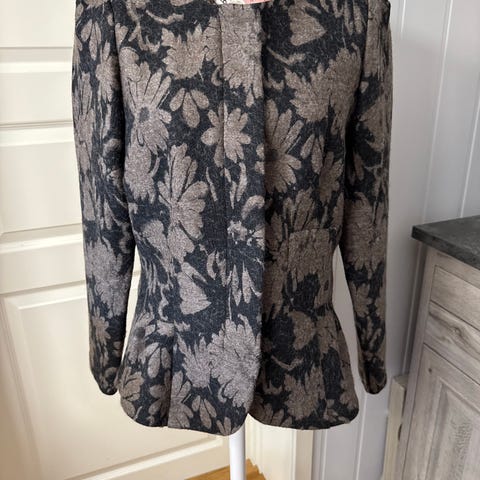 Elegant jakke i nydelig jacquardmønster i mørke nyanser. Klassisk snitt med knapper foran og lett utsvingt fasong. Stoffet har en vakker struktur med blomster og bladmotiv. Perfekt til både hverdags og selskap.