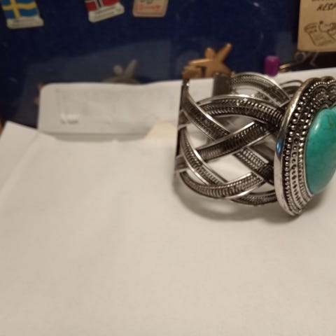 Armbånd i tinn med rosa stein. Kunsthåndverk fra Sverige. Indre mål: 17,5 cm.