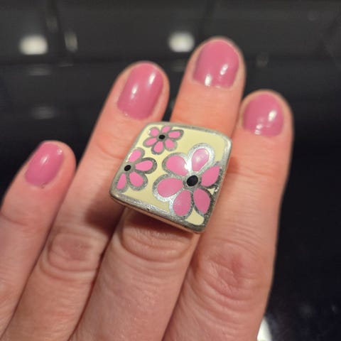 Rhodiumbelagt med lys ametyst-krystall. Glitrer i myke rosatoner.
