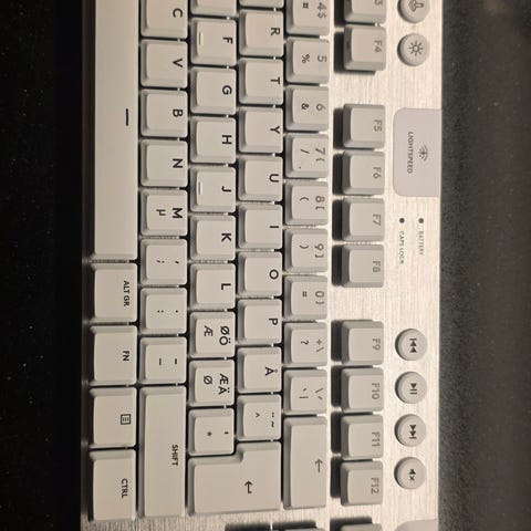 Logitech G915 TKL tastatur med trådløs teknologi og RGB-belysning. Tastaturet har et kompakt design uten numerisk tastatur, noe som gir mer plass på skrivebordet. RGB-belysningen kan tilpasses etter preferanser. Det er ideelt for både gaming og produktivitet.