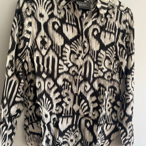 Nydelig skjortekjole med lange ermer og knappelukning i hele fronten. Feminin med markert midje (midjebelte) og lengde litt under knærne ca. Beige knappestolpe med fine gullknapper. Stoff i viskose.
