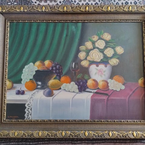 Oljemaleri av Sverre Hamnes. Mål : bredde 55 x høyde 47 inkludert ramme. Stilleben med frukt og blomster. Må hentes.