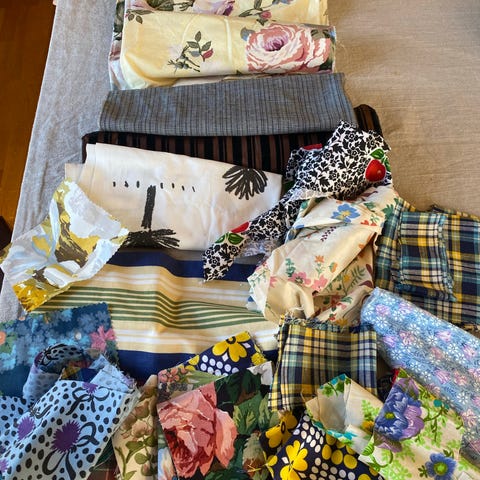 Stoffer ferdig klippet til lappeteppe, disse er i størrelsen 15x15 cm. Har ikke telt alle, men det er en del 😅